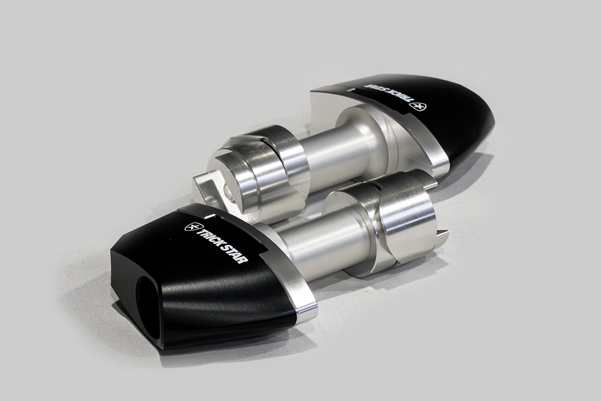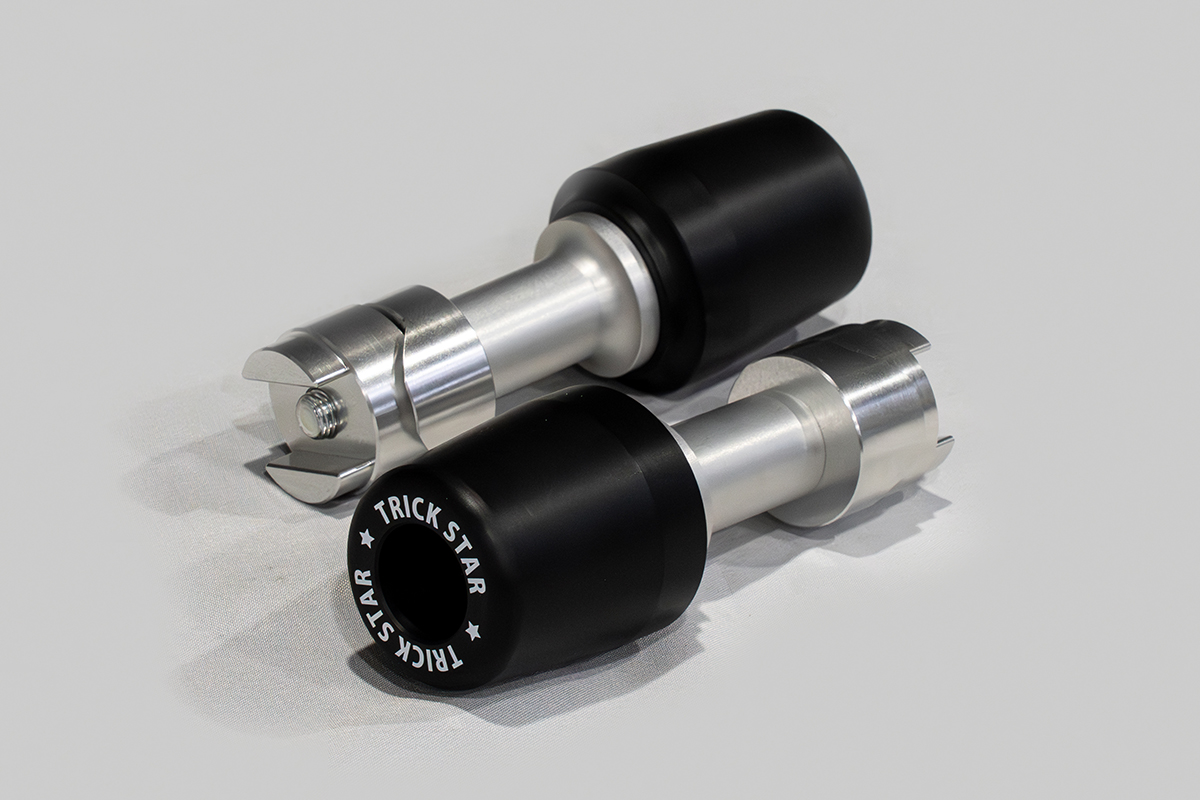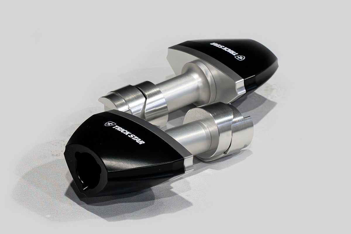 TRICK STARフレームスライダーのジュラコン®はスタンダードタイプの他、TRICK STAR独自のTYPE-D・TYPE-Eの異形型のジュラコン®をラインナップし、プロテクトの他アクセサリー要素を高め機能性とルックスを両立したフレームスライダーです。ジュラコン®形状による機能差はなく、本製品の車両への取付けはカウル加工不要です。